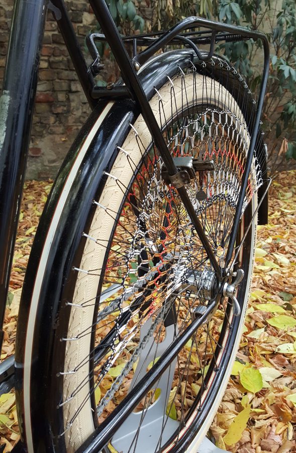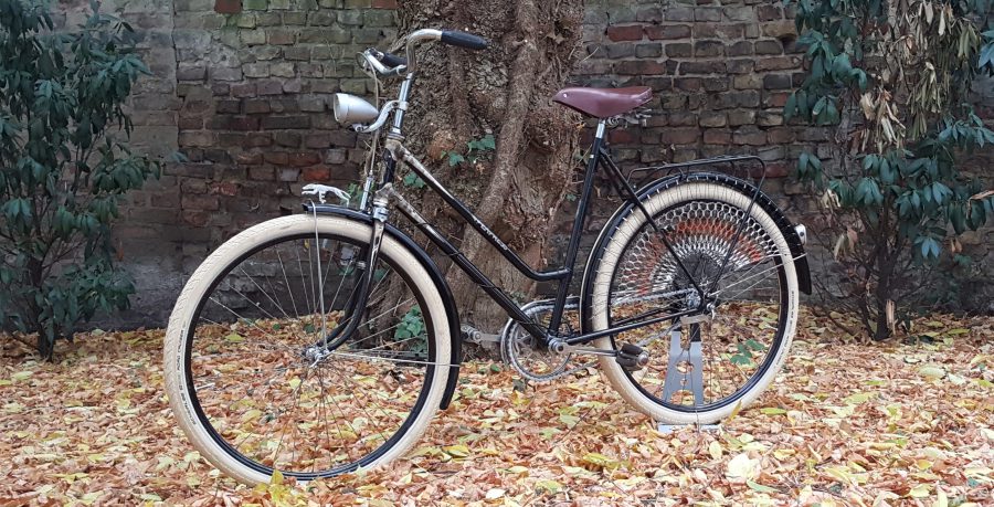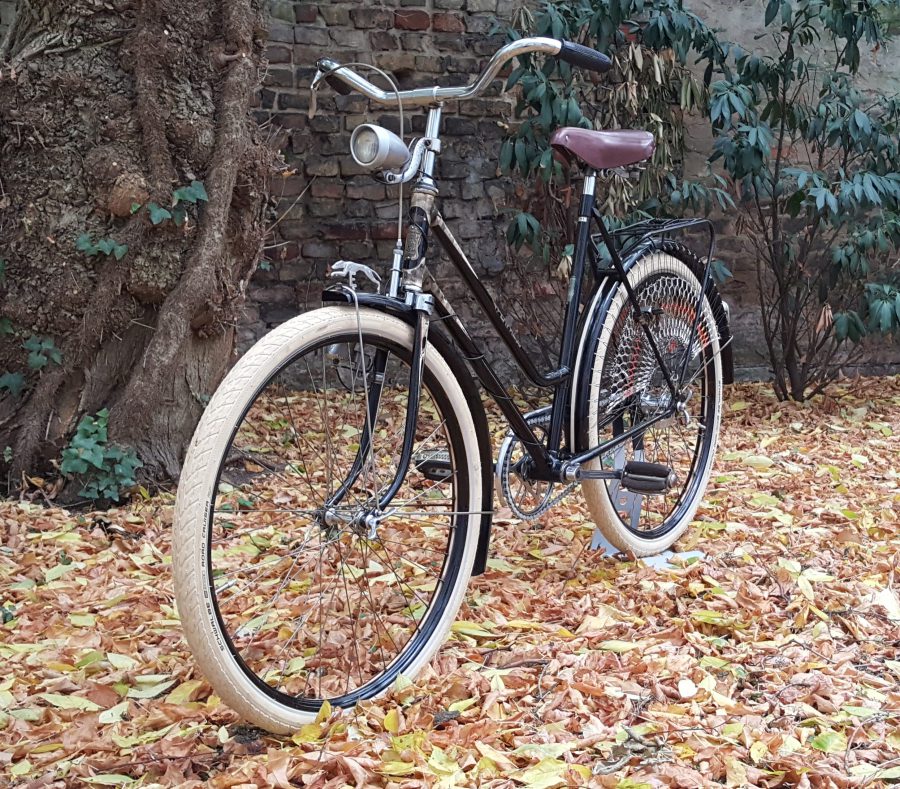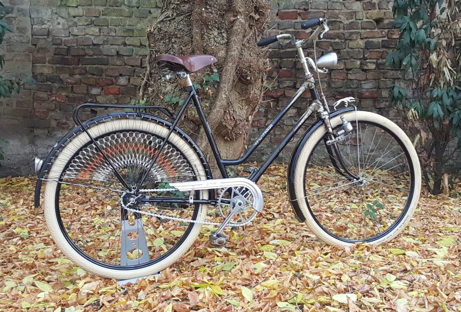 Das Damenfahrrad der Traditionsmarke Express wurde bis auf die letzte Schraube zerlegt, gereinigt und wieder zusammengesetzt. Sämtliche Lager sind gewartet und eingestellt sowie der Lack aufbereitet und konserviert. Weiterhin ist das Rad ausgestattet mit einer Berko Lichtanlage und einem farblich auf den Lack abgestimmten Rocknetz.