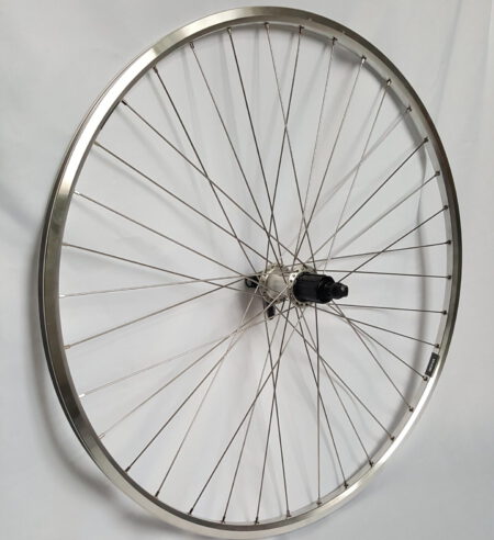 Hinterrad für Rennräder 28 Zoll Silber poliert. Rubustes von Hand gespeichtes Hinterrad. Mehrfach abgedrückt und mittig zentriert. Passend für ältere Renrräder mit einem Einbaumaß 130 mm. Für 7-8-9-10 Fach Kassetten Freiläufe.
