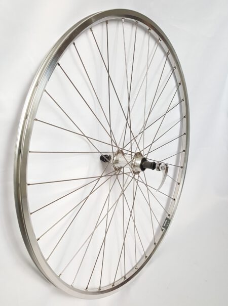 Hinterrad für Vintage Rennräder 130 mm 28 Zoll Silber poliert mit schmaler Ryde Chrina Felge . Rubustes von Hand gespeichtes Hinterrad. Mehrfach abgedrückt und mittig zentriert. Passend für ältere Renrräder mit einem Einbaumaß 130 mm.